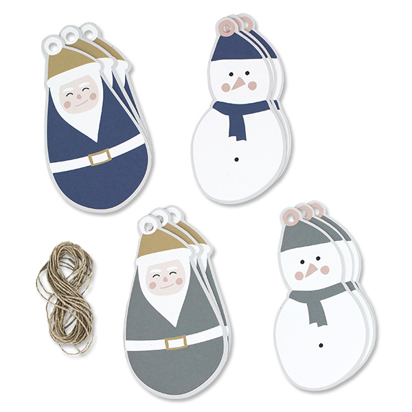 Set mit 12 Geschenanhängern (6 x Weihnachtsmann, 6 x Schneemann) in einer Geschenkbox.