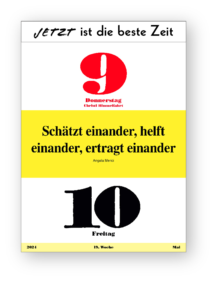 Die Woche beginnt mit dem Montags-Blatt, das Ihnen den Wochenbeginn durch einen Leitspruch mit Kommentar verschönert, und setzt dann mit Zwei-Tages-Blättern mit jeweils einem Spruch fort.