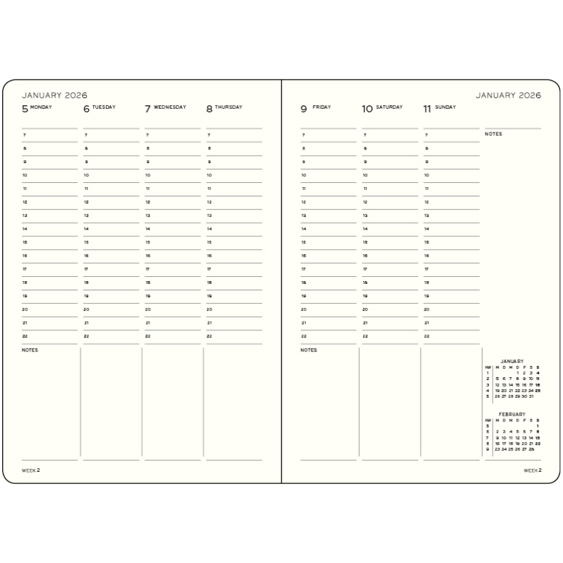 • Für Samstag und Sonntag je eine Spalte, im Format Pocket (A6) teilt sich Samstag und Sonntag eine Spalte