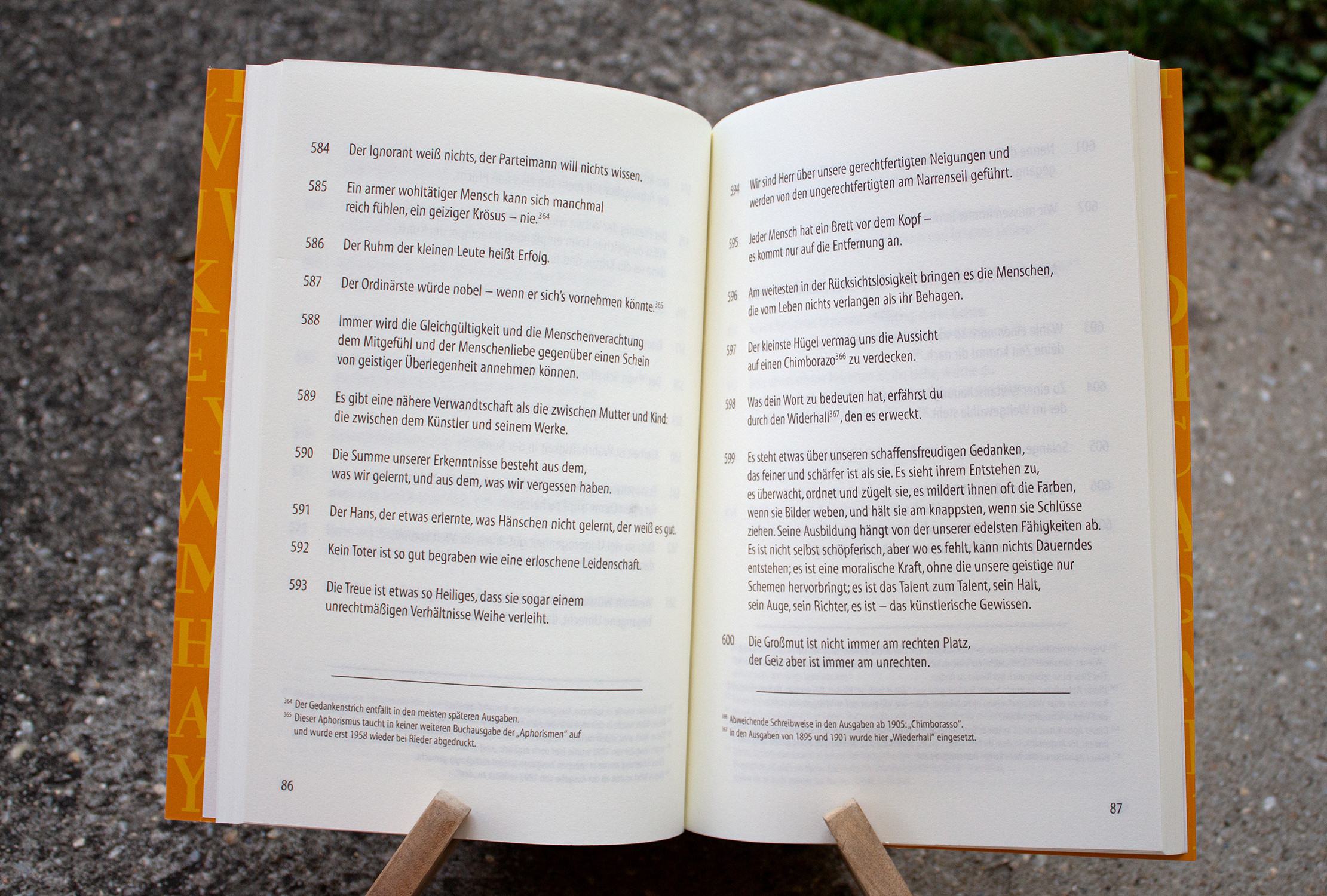 Diese Neuausgabe der „Gesammelten Aphorismen" von Marie von Ebner-Eschenbach (1830-1916) stellt die erste chronologisch geordnete Ausgabe ihrer Aphorismen dar. Dabei fanden nicht nur – wie sonst üblich – die Aphorismen der Werkausgaben von 1893 und 1920 Berücksichtigung, sondern auch eine Vielzahl weiterer Aphorismen, die entweder zu Lebzeiten der Autorin in Zeitungen, Zeitschriften und Anthologien veröffentlicht, oder nach dem Tod der Autorin aus dem Nachlass herausgegeben wurden. Darüber hinaus wurden in hunderten Fußnoten die vielfachen Änderungen und Überarbeitungen der „Aphorismen" chronologisch dokumentiert und somit eine wichtige Vorarbeit für eine spätere historisch-kritische Gesamtausgabe der Aphorismen geleistet.