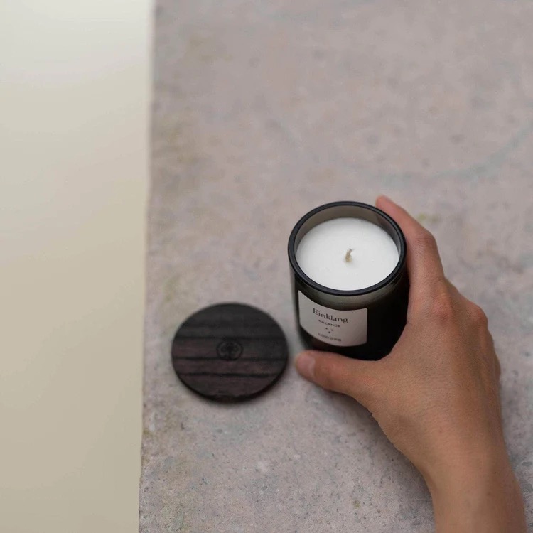 Natürliche Duftkerze aus pflanzlichem Wachs und 100 % naturreinen ätherischen Ölen. Mit Deckel aus gebeizter Eiche. Handgemacht in Salzburg.