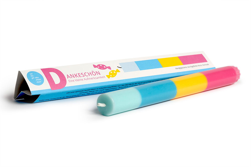 Mehrfarbige Kerze mit Botschaft. Als Geschenk, Glückwunsch oder als Gruß einzeln in farbiger Kartonage verpackt. Die Kerze ist aus durchgefärbtem Wachs, bei der Fertigung wird Farbschicht für Farbschicht von Hand gegossen.
