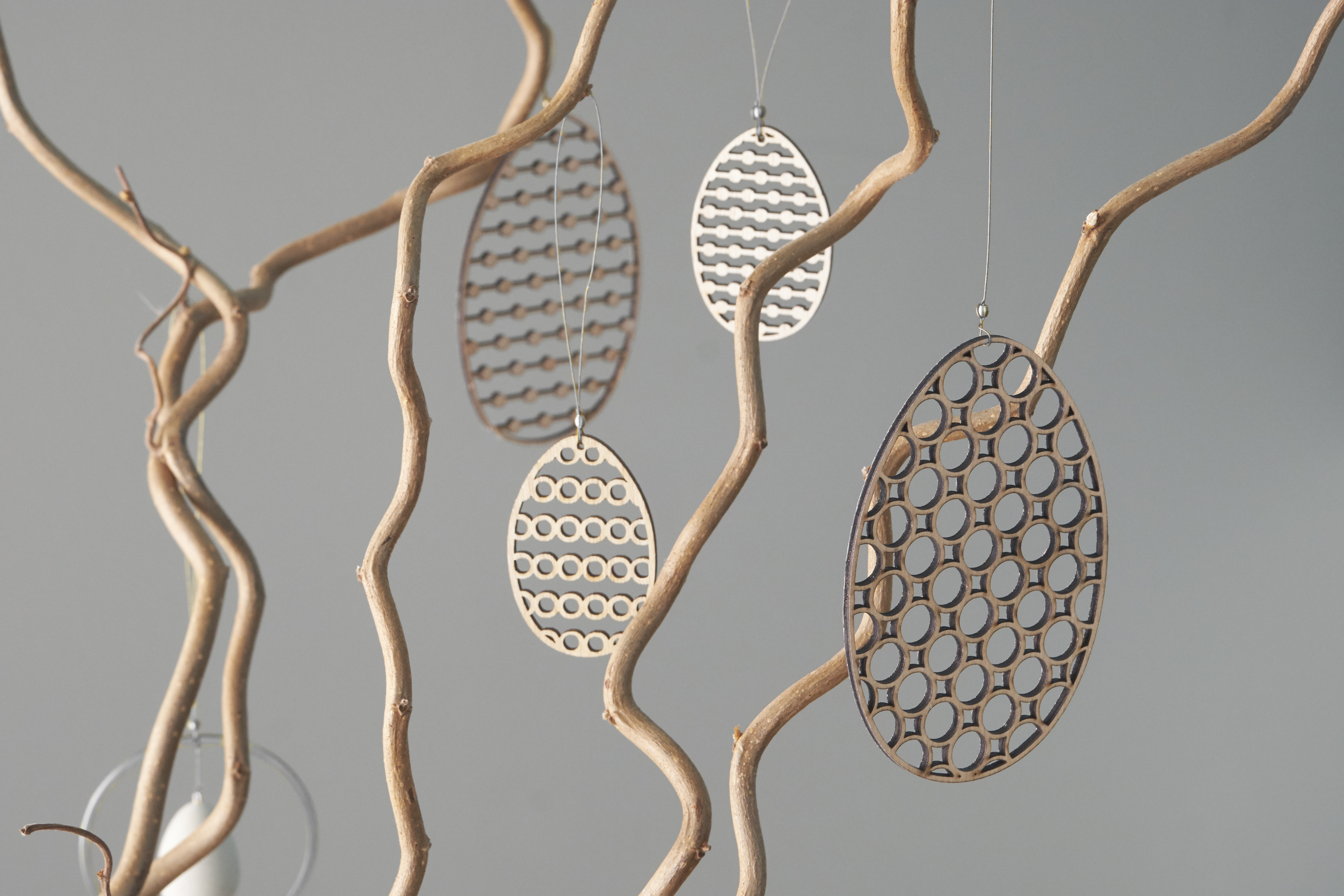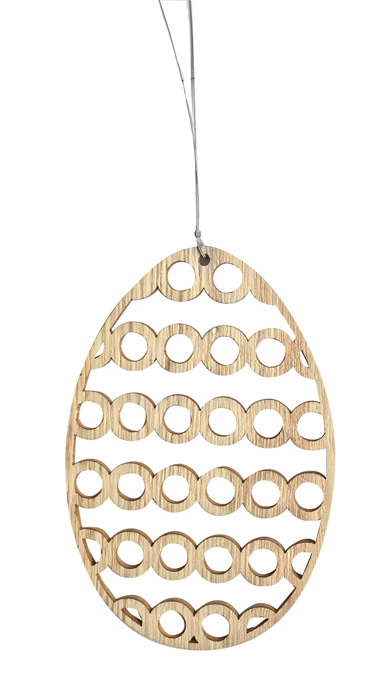 Anhänger aus Holz mit Aufhängung aus silberfarbenem Draht, der Draht ist ca. 10 cm lang.