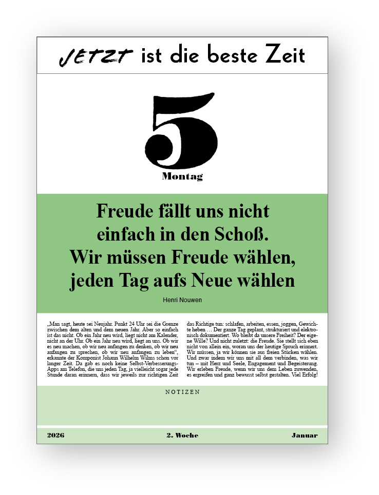 Die Woche beginnt mit dem Montags-Blatt, das Ihnen den Wochenbeginn durch einen Leitspruch mit Kommentar verschönert, und setzt dann mit Zwei-Tages-Blättern mit jeweils einem Spruch fort.