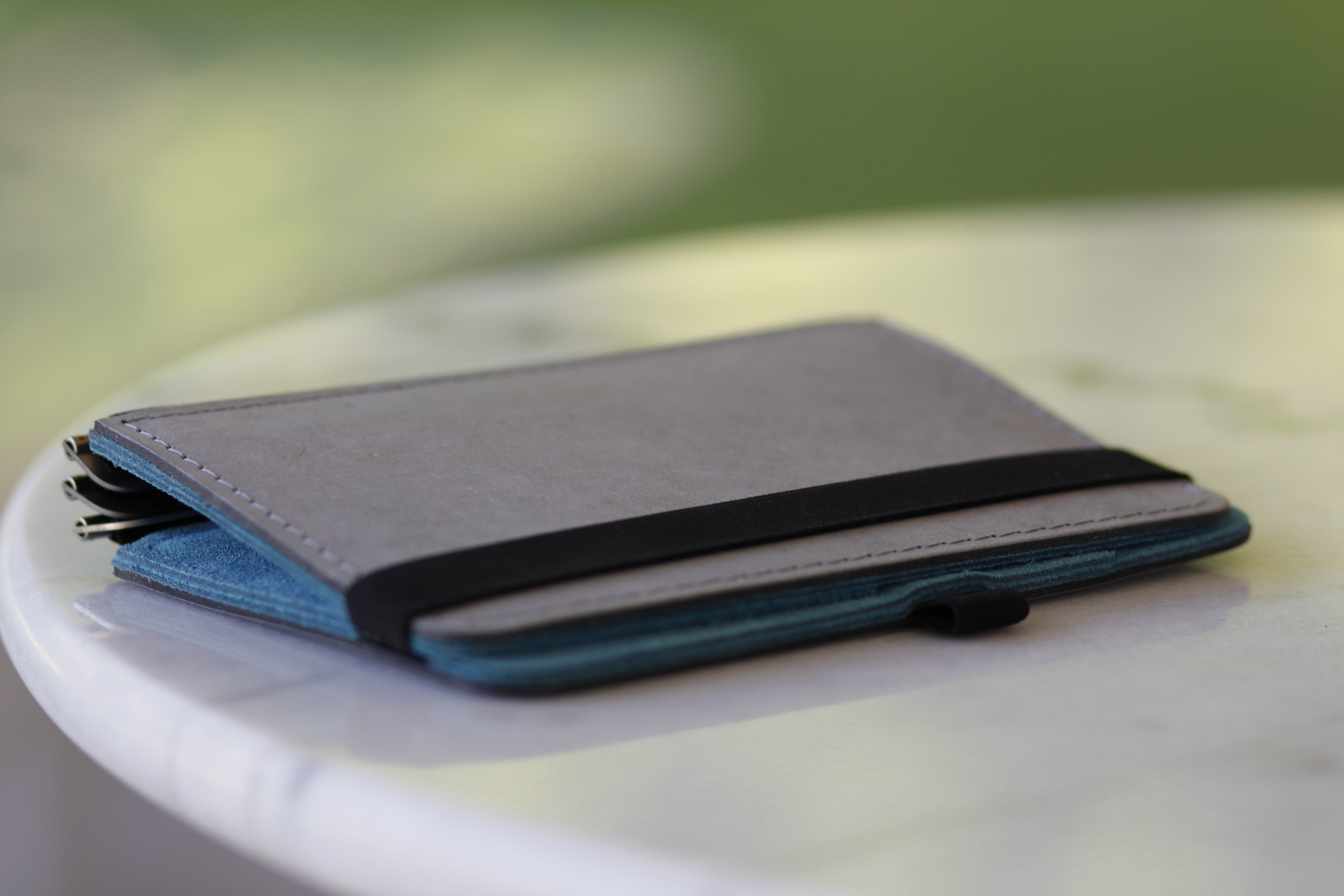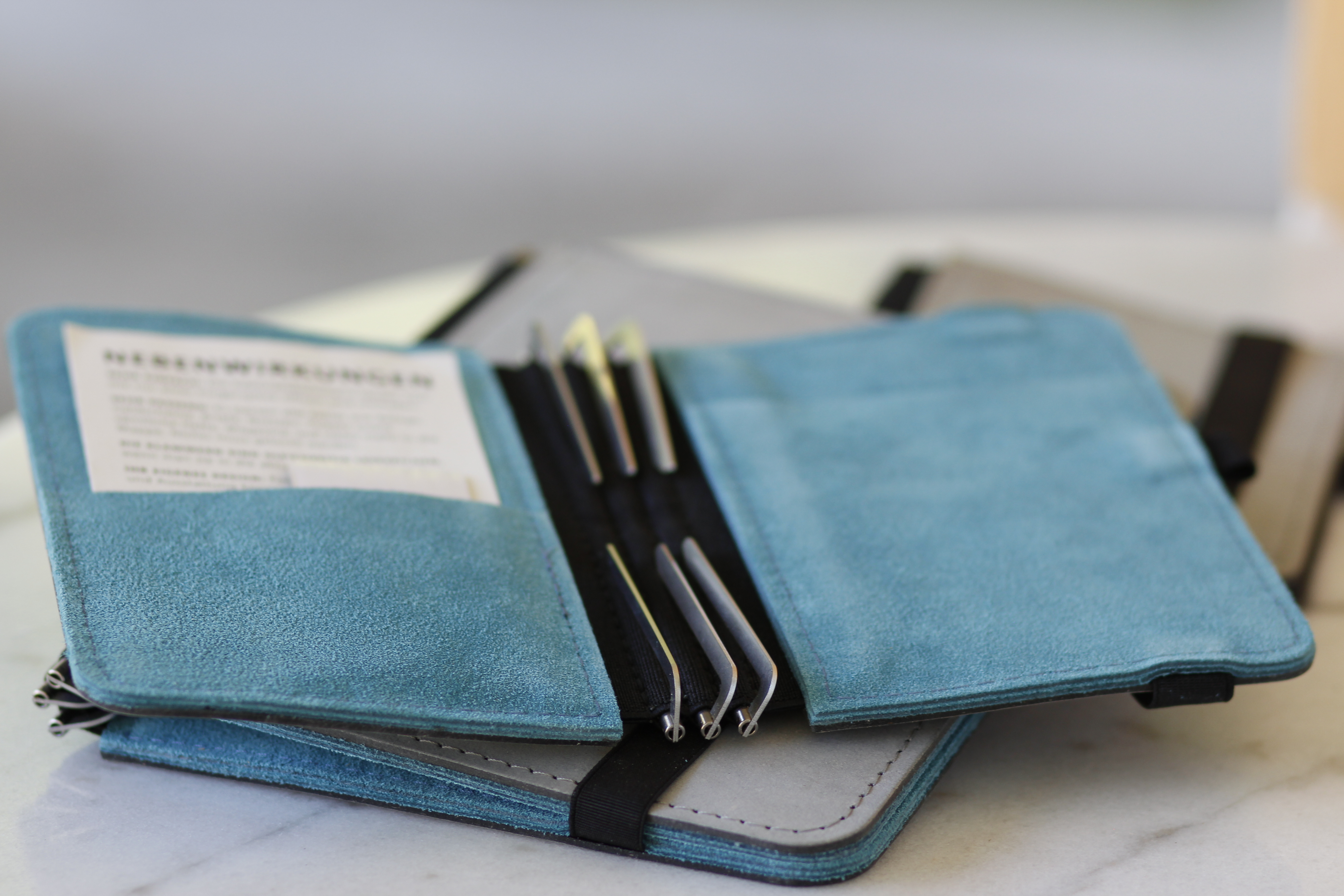 ROTERFADEN Taschenbegleiter, eine Quer-Innentasche vorne, eine hohe Quertasche hinten, 3 Bügelklammern aus Edelstahl, Stiftehalter an der Seite sowie breites Gummiband außen zum Verschließen. Passend für Format A6 Außenmaterial: Recyclingleder (siehe Bild) Innenmaterial: Veloursleder türkis Recyclingleder. Ein neues Material! Produktionsreste aus der Verarbeitung vegetabiler Leder werden mit Naturlatex zu diesem RECYCLINGLEDER verbunden. So wird auch der Verschnitt eines hochwertigen Rohstoffs optimal genutzt. Die dunkelgraue Oberfläche ist abwaschbar. Das Recyclingleder ist etwas standiger als das ROTERFADEN LEDER.