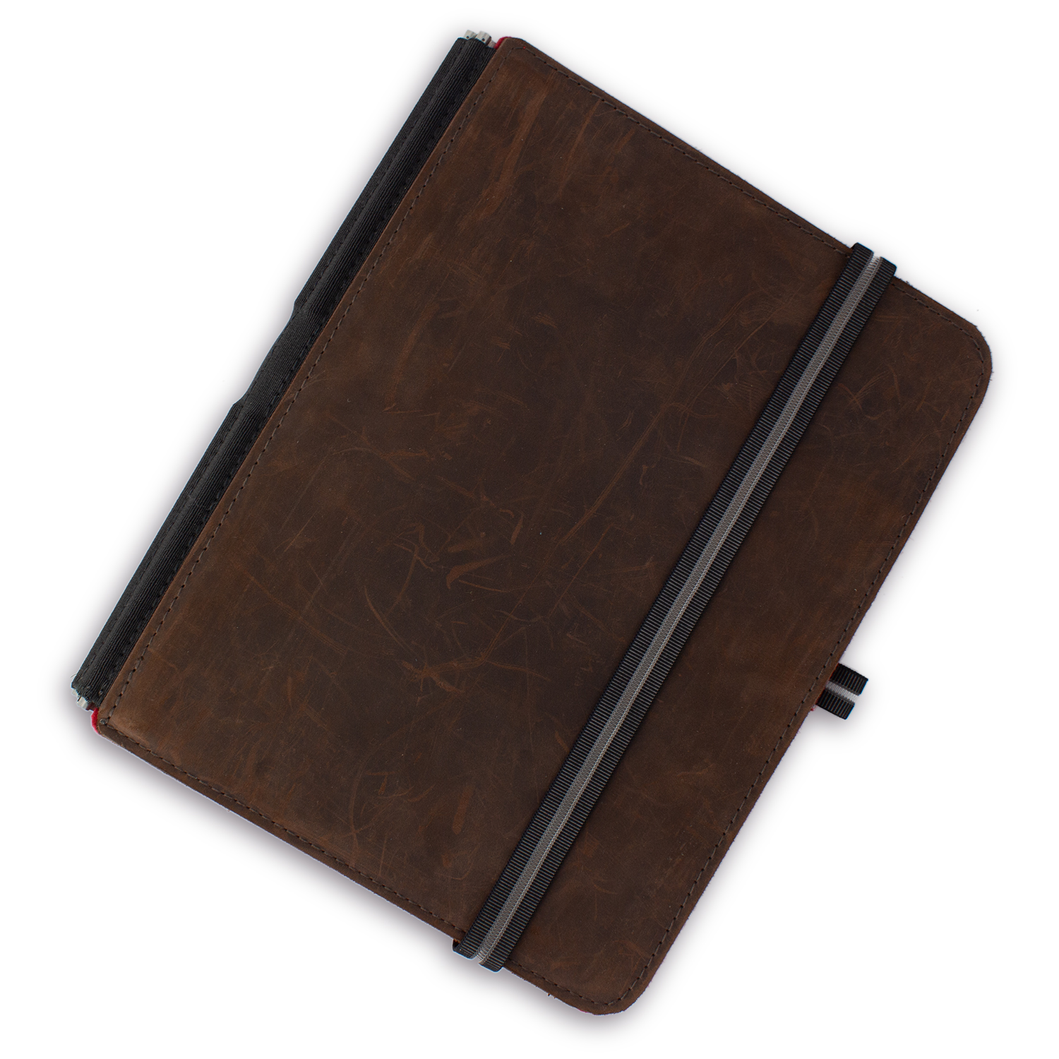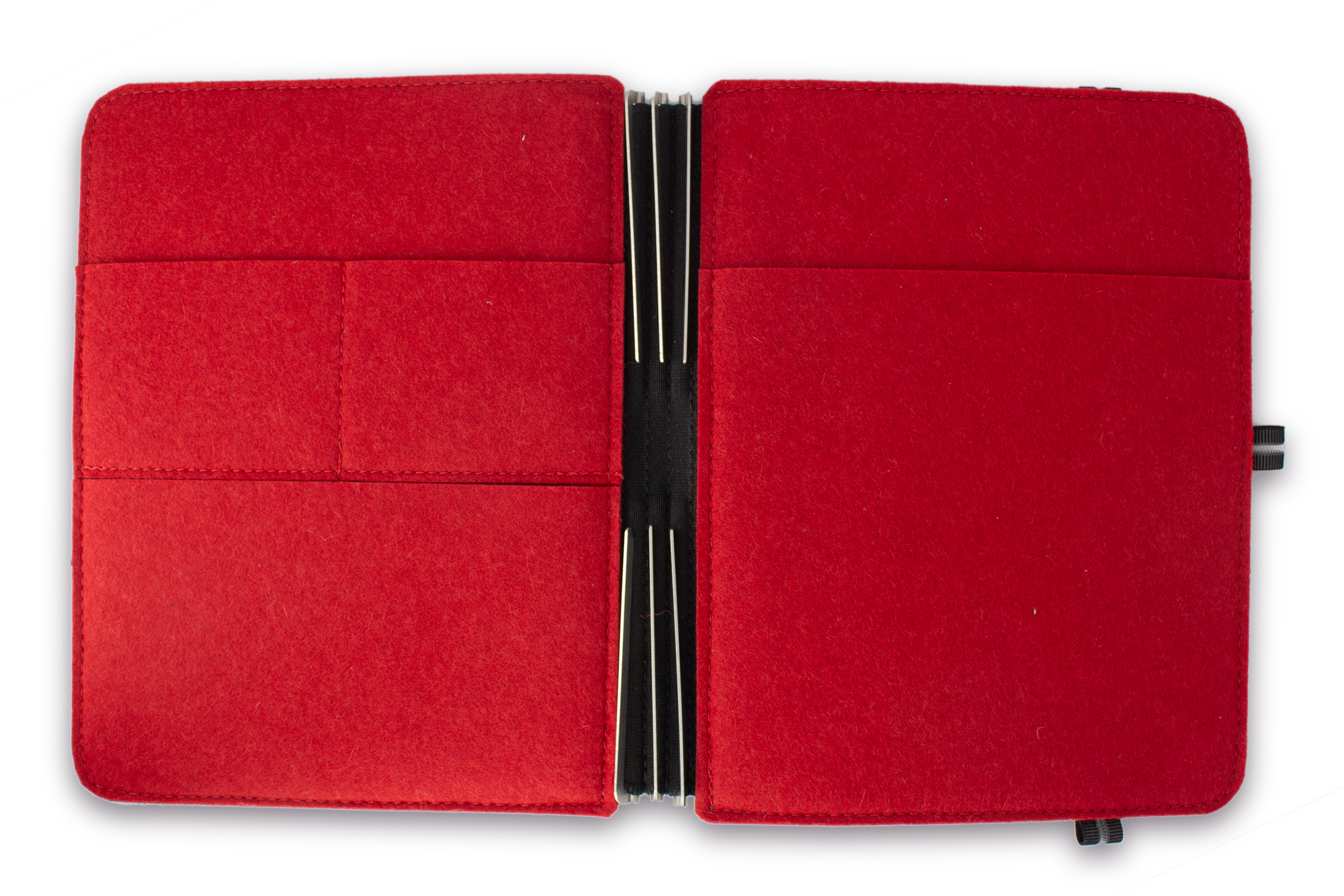 TB Sonderformat (20,5 x 27 cm) aus braunem Recyclingleder mit rotem Filz und schwarzem Gummiband. Vielseitige Innentaschen für Tablet oder Block.