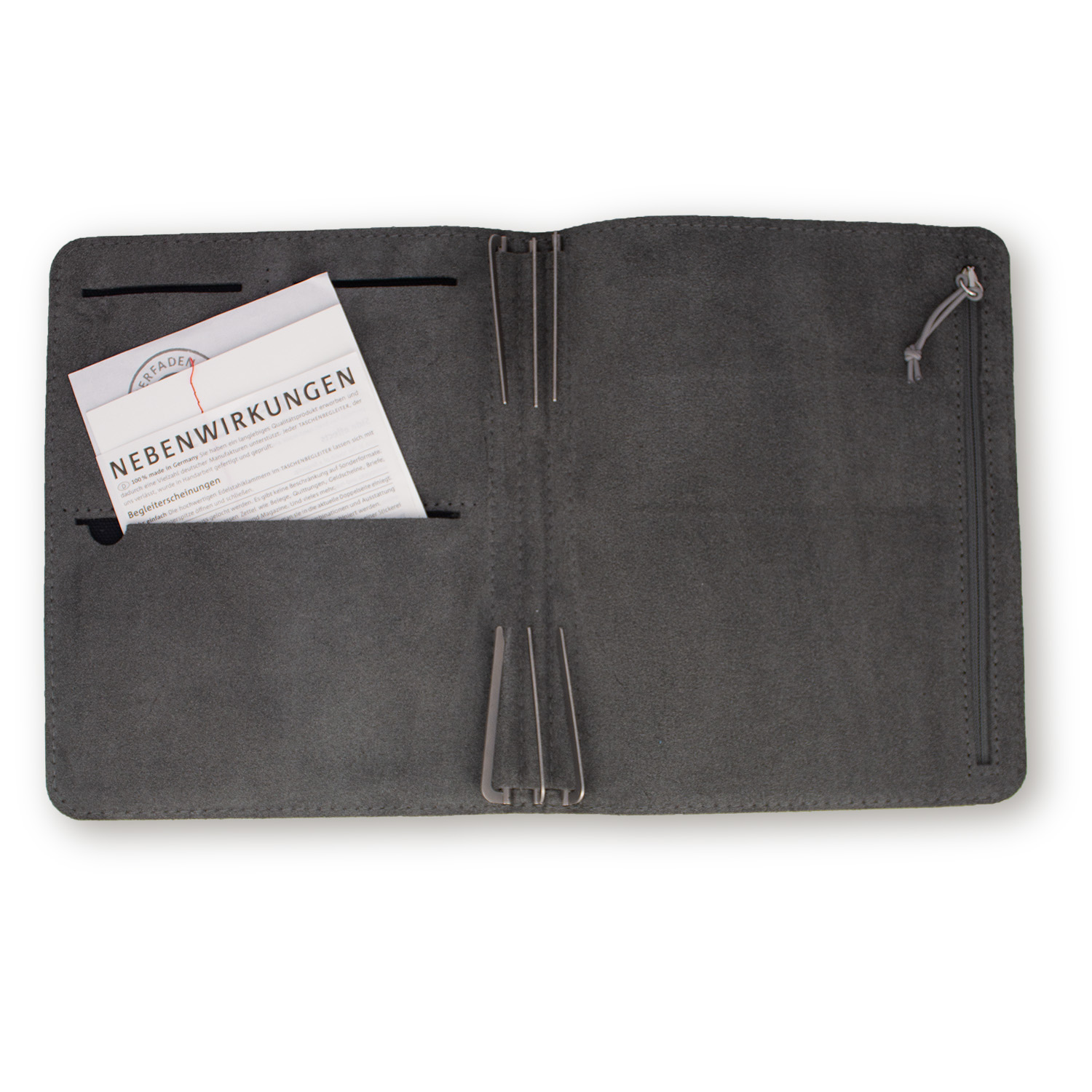 Außen chromfreies, weiches Glattleder // Gewachstes Canvas und chromfrei gegerbtes Veloursleder im Inneren // drei Klammerpaare // Reißverschlussfach im Inneren // Überformat A5 (ca. 15,5 x 22 cm)