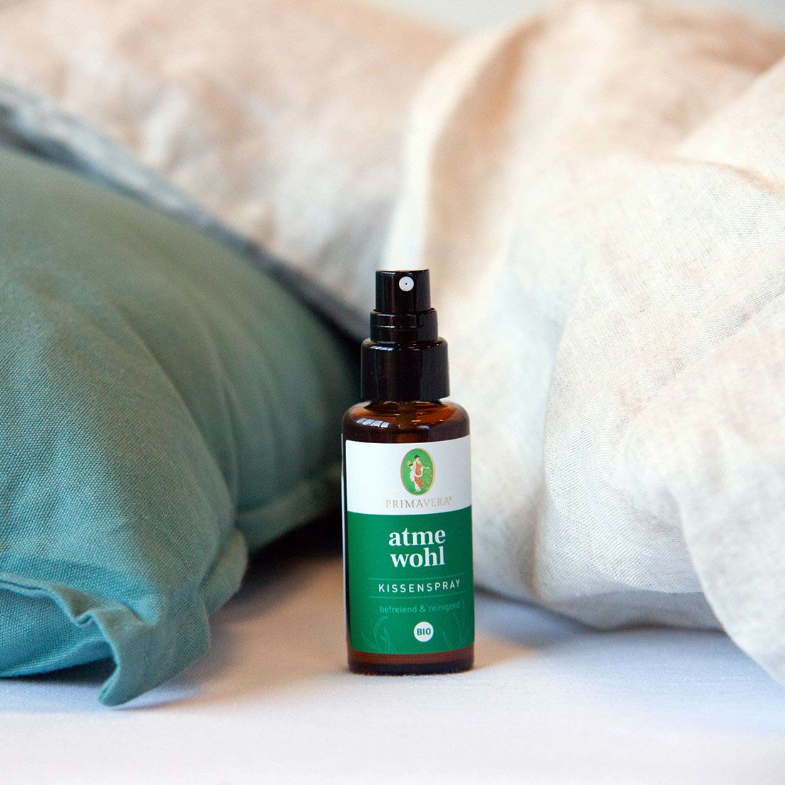 Eine bewusste Atmung ist ein wichtiger Bestandteil für Gesundheit und Wohlbefinden. Besonders in der kalten Jahreszeit ist die vorbeugende Pflege sehr wichtig, um sich auch bei niedrigen Temperaturen wohlfühlen zu können. Das Kissenspray aus 100 % naturreinen ätherischen Ölen sorgt für einen entspannenden Duft und schenkt ein frisches Atmewohl-Gefühl. Ätherisches Eukalyptusöl stärkt und erfrischt. Ätherisches Zirbelkieferöl unterstützt den guten Schlaf und klärt und reinigt nicht nur die Raumluft, sondern auch den Geist. Direkt auf das Kissen oder auch in die Raumluft gesprüht erfrischt das Spray Textilien.