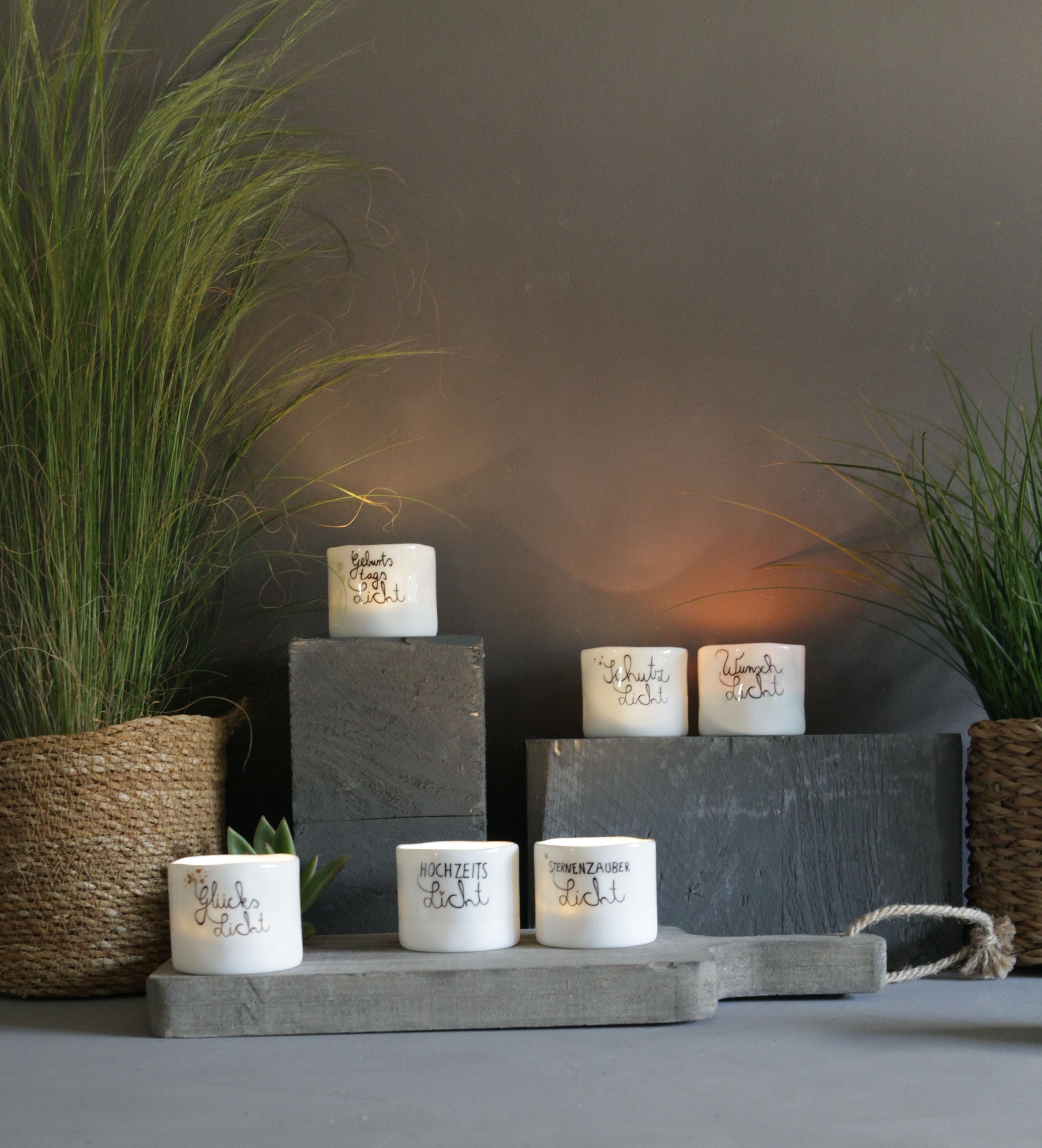 Leuchtende Wünsche. Diese feinen Porzellanlichter lassen Wünsche aufleuchten und bringen Glück und Schutz zu Geburtstagskindern und Hochzeitspaaren. Jedes Licht trägt einen Schriftzug und ist auf der an-deren Seite mit feinen Ausschnitten und Grafik gestaltet. Ein Geschenk voller Licht und Liebe.