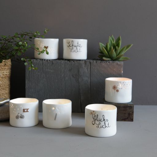 Leuchtende Wünsche. Diese feinen Porzellanlichter lassen Wünsche aufleuchten und bringen Glück und Schutz zu Geburtstagskindern und Hochzeitspaaren. Jedes Licht trägt einen Schriftzug und ist auf der an-deren Seite mit feinen Ausschnitten und Grafik gestaltet. Ein Geschenk voller Licht und Liebe.