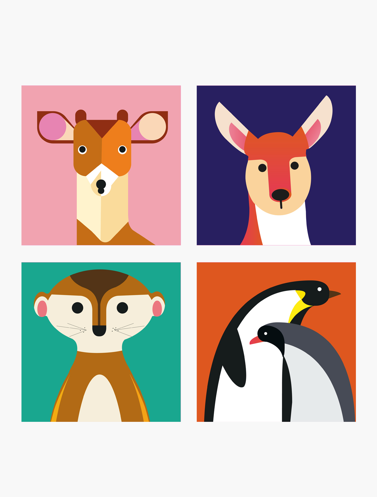 Schau doch mal! Vier bunte Magnete mit Tieren aus der Wüste, der Savanne und dem Urwald.