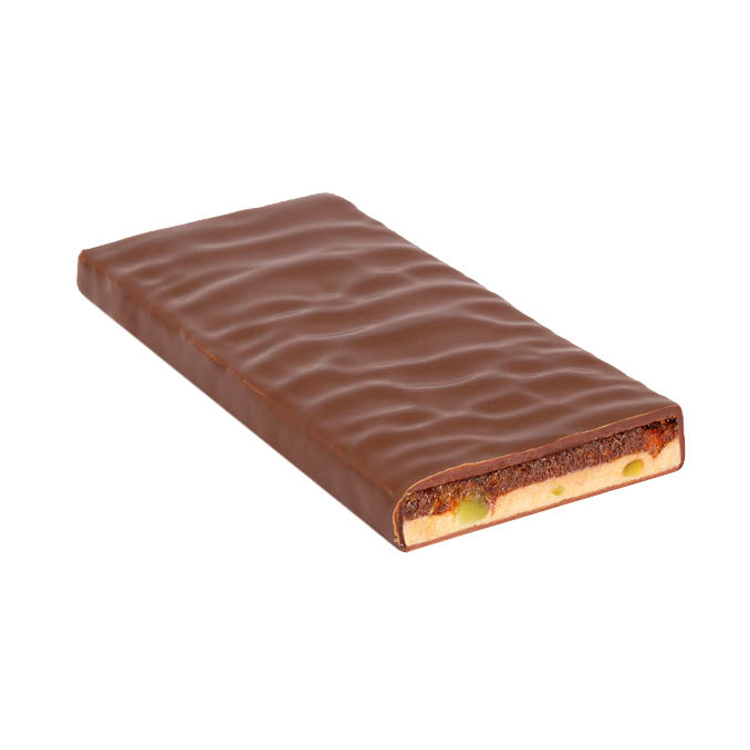 Dunkle Milchschokolade 50% gefüllt mit Erdbeer-Marzipan und Pistazien-Mandelnougat