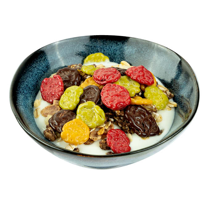 4 Sorten: süße Karamellflakes, fruchtig-rote Himbeerflakes, Grünteeflakes und dunkle Schokoflakes – die schönen Farben entstehen ganz natürlich nur aus Himbeeren und Grüntee. Knackig-schokoladiger Knabberspaß!