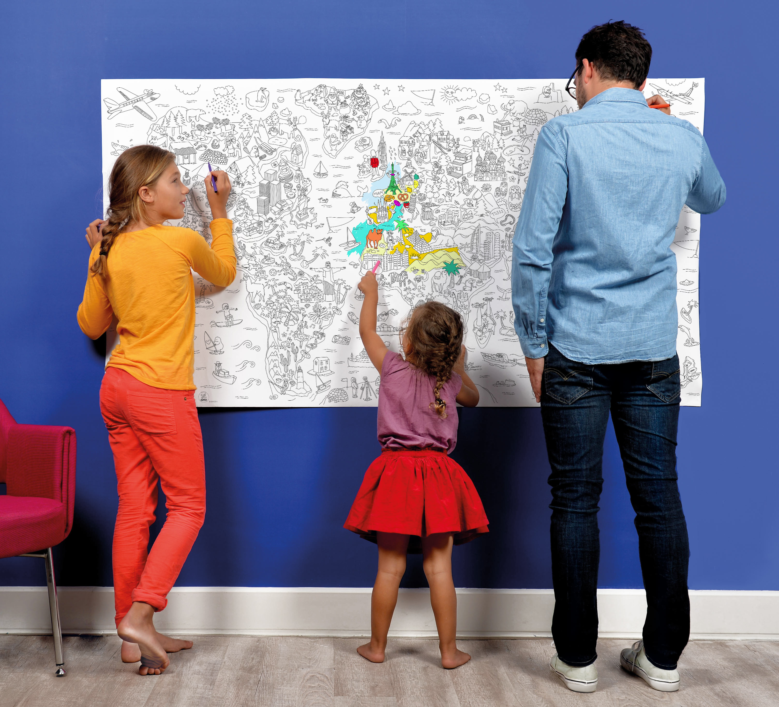Eine Weltkarte zum Ausmalen! Alleine oder mit Freunden. Sie können Ihrer Fantasie und Kreativität freien Lauf lassen und das Poster ausgerollt auf dem Boden, an der Wand befestigt oder als Tischdecke benutzen.