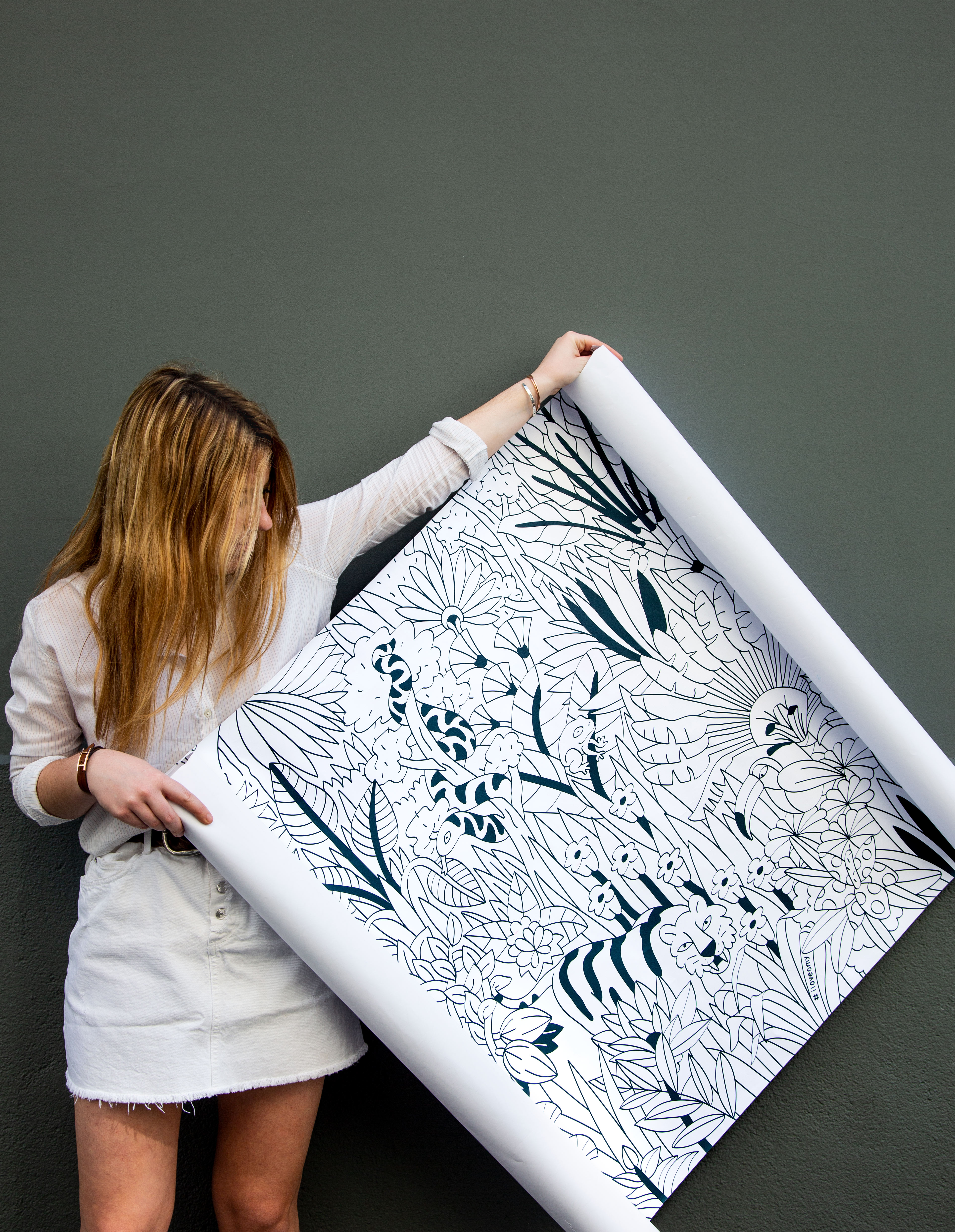 Ein ganzer Jungel zum selber Ausmalen! Alleine oder mit Freunden. Sie können Ihrer Fantasie und Kreativität freien Lauf lassen und das Poster ausgerollt auf dem Boden, an der Wand befestigt oder als Tischdecke benutzen.