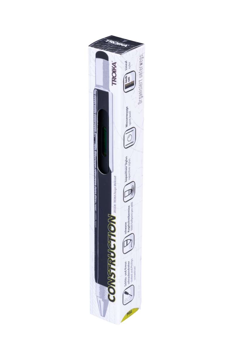 - Kugelschreiber, Planungshilfe und Werkzeugkoffer in einem. Mit Zentimeter- und Zoll-Lineal, 1:20 m und 1:50 m Skala, Wasserwaage, Schlitz- und Kreuzschraubendreher und Stylus.