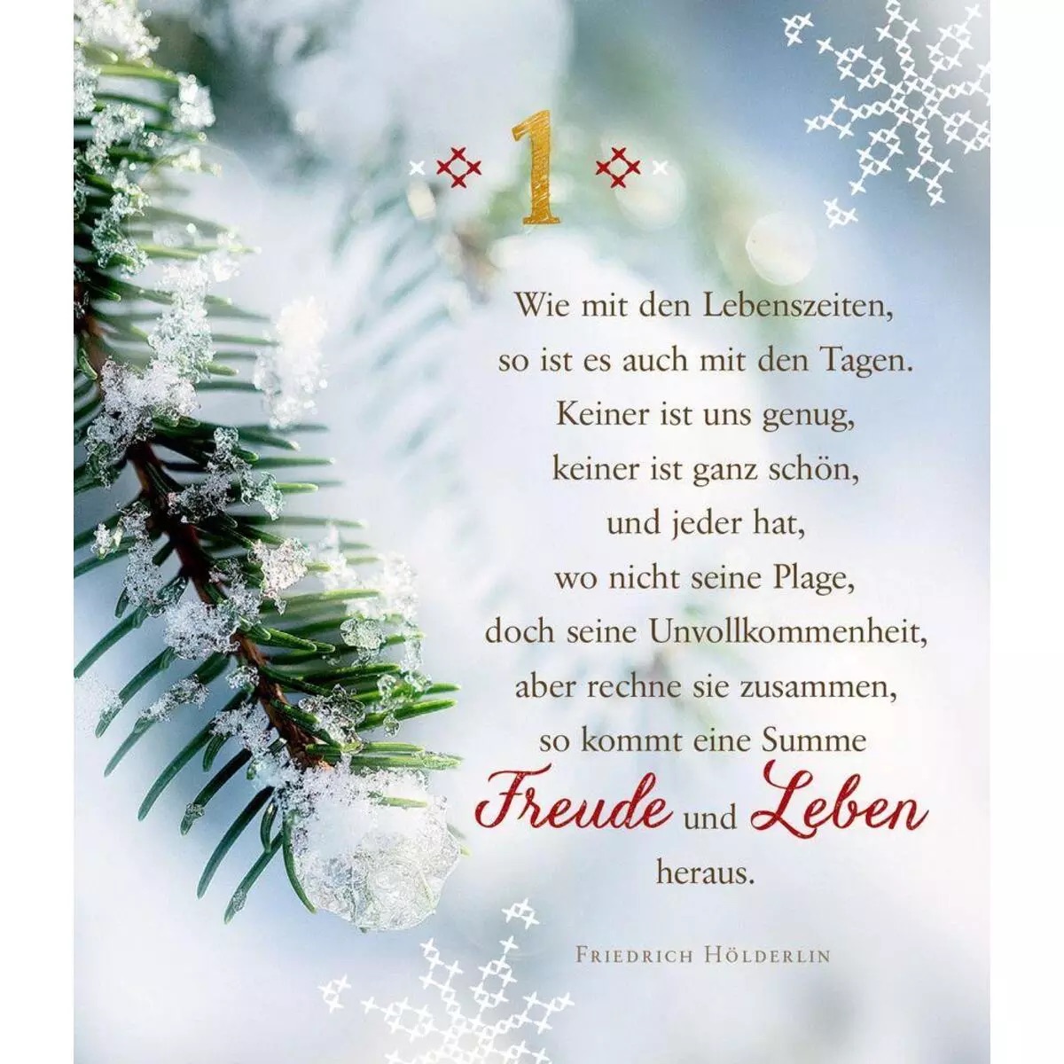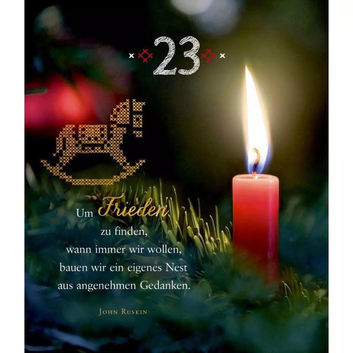 Stimmungsvoll arrangierte Fotos mit Aphorismen, Gedichten und Versen bekannter Persönlichkeiten schenken Ruhe und Besinnlichkeit in der oft turbulenten Vorweihnachtszeit. Sie geben uns positive Impulse für den Tag und stimmen uns auf das Fest der Liebe und des Friedens ein.