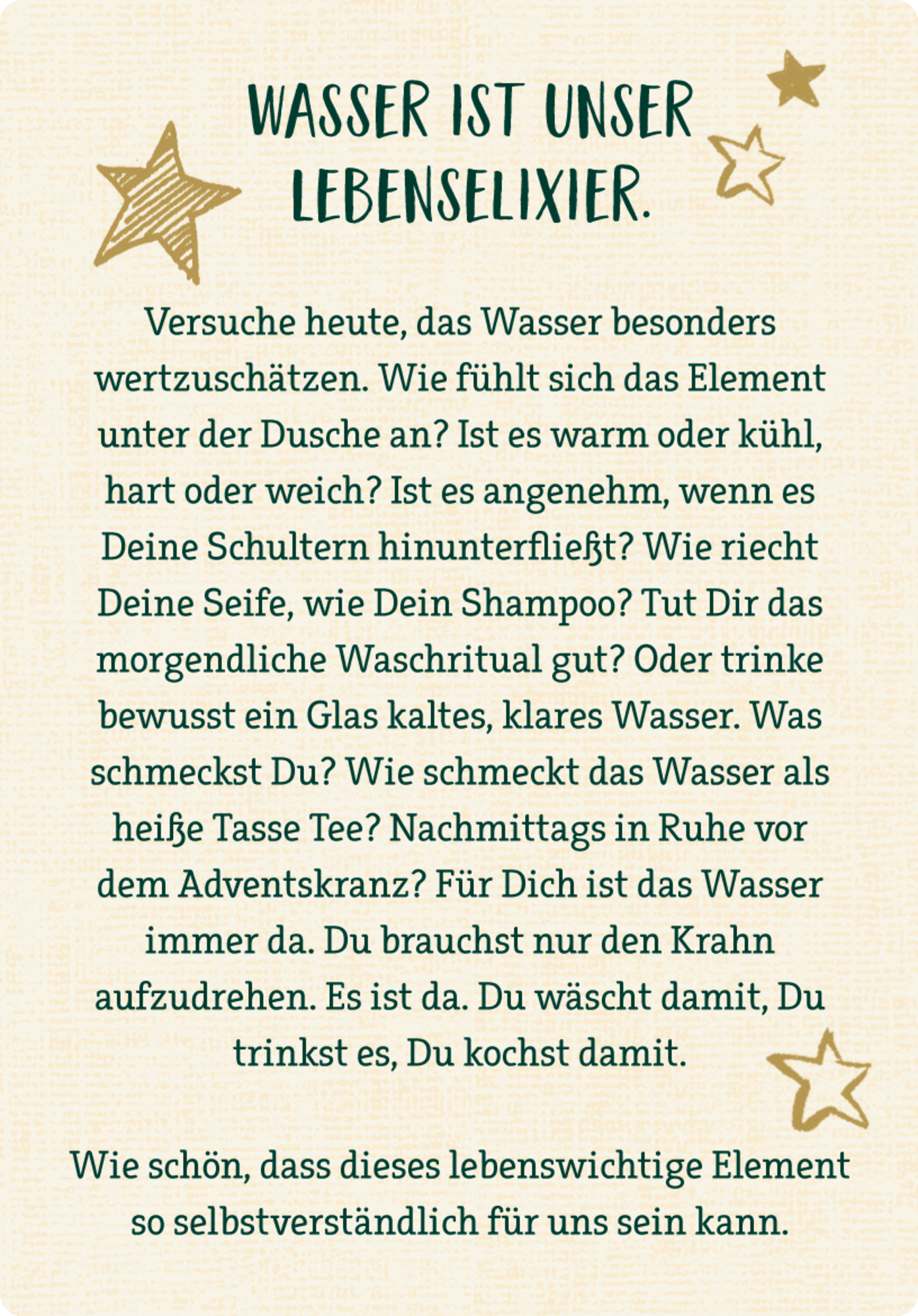 Gerade in der Adventszeit sehnen sich viele von uns nach Entschleunigung, stillen Momenten und mehr Achtsamkeint. Die poetischen Texte in dieser Schmuckschachtel lassen uns innehalten und schenken zusammen mit dem zauberhaften Windlicht strahlende Momente.