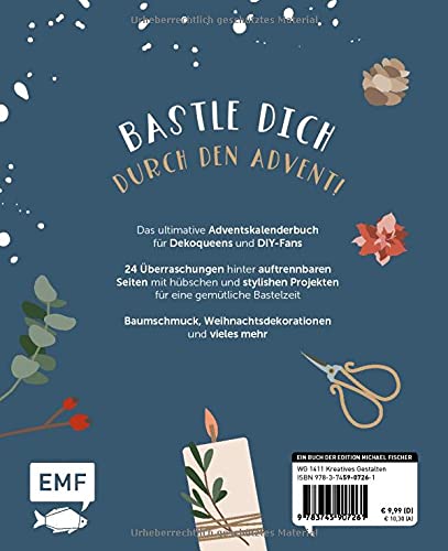 24 Bastelprojekte zum Dekorieren und Schenken – Mit perforierten Seiten zum Auftrennen. Laß dich jeden Tag im Advent hinter einem Buchtürchen von einem schönen DIY-Projekt überraschen! Festliche Deko selber machen ist gar nicht schwer. Adventskränze, Fenster- und Tischdeko oder Christbaumschmuck zu basteln ist nicht nur dekorativ – es bietet sich auch 24-mal die Möglichkeit zu einer kleinen kreativen Auszeit im Vorweihnachtsstress. Weihnachtsdeko, Baumschmuck, kleine Geschenke für die Liebsten und noch viel mehr warten darauf, gebastelt zu werden.