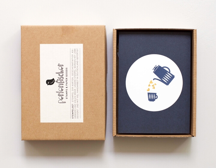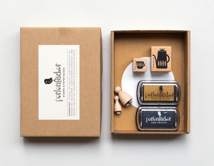 Das Set besteht aus 4 Stempeln, 2 Stempelkissen mini, 6 Postkarten, 9 Geschenkanhängern, 1 original handgestempelten Karte und dem Perlenfischer Ideenbooklet.